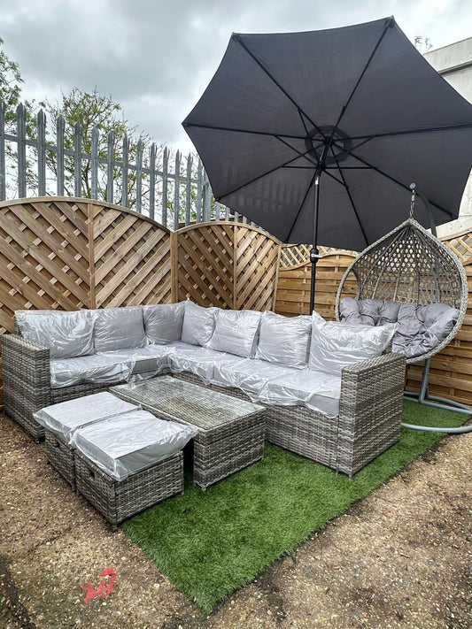 Garden Furniture Bundle 2 - Rattan Corner Lounge Set, Egg Chair, Parasol & Base