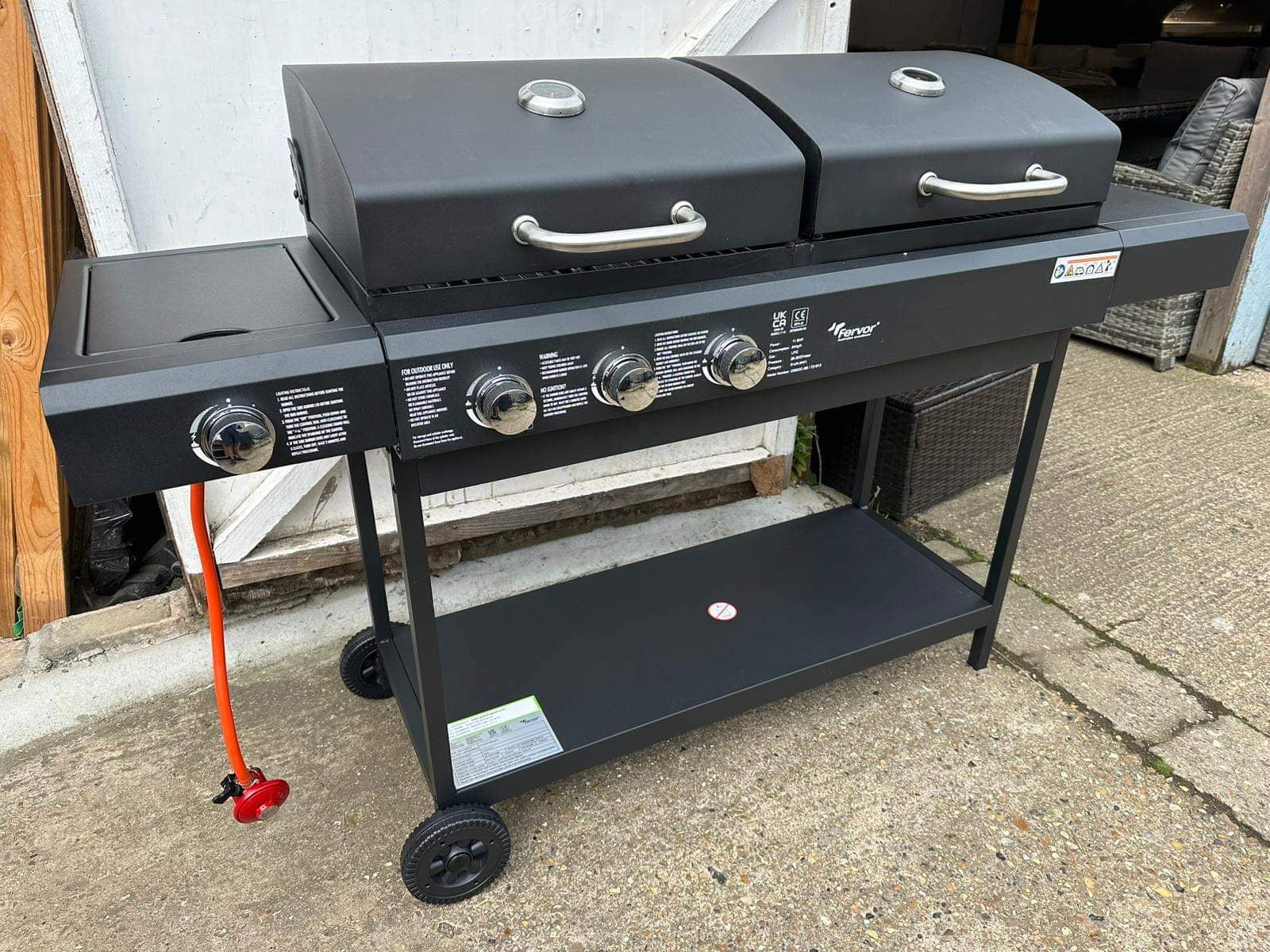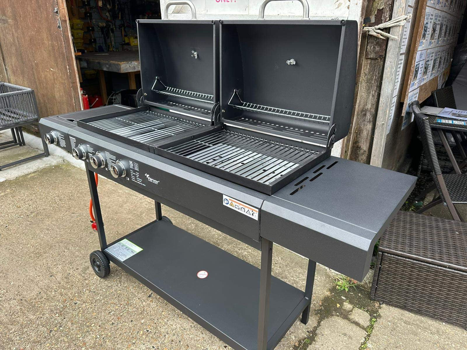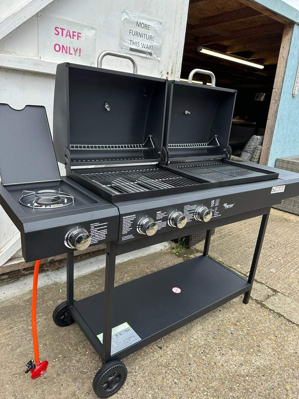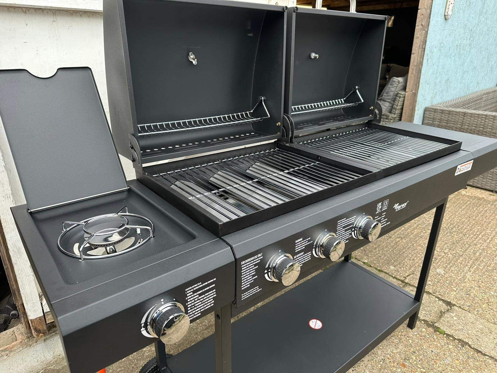 Black matte finish half gas half charcoal Combi BBQ with side burner.