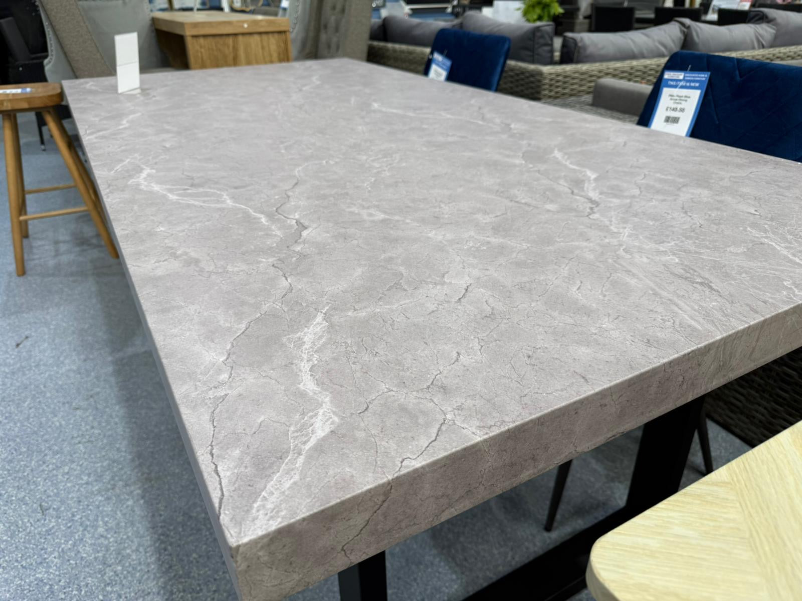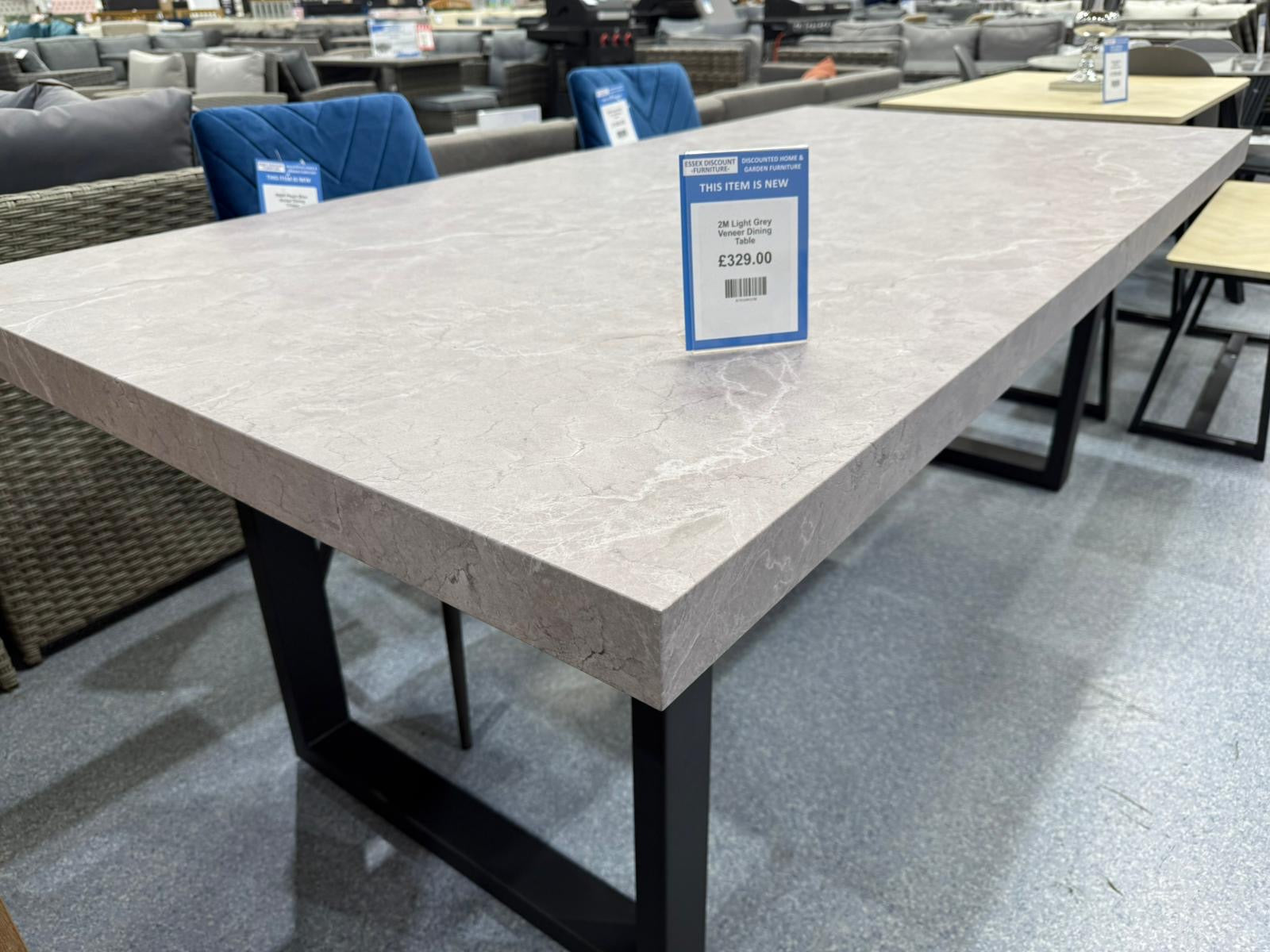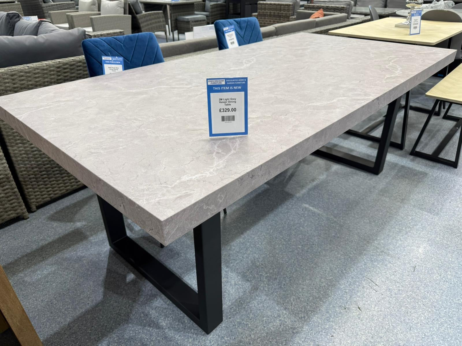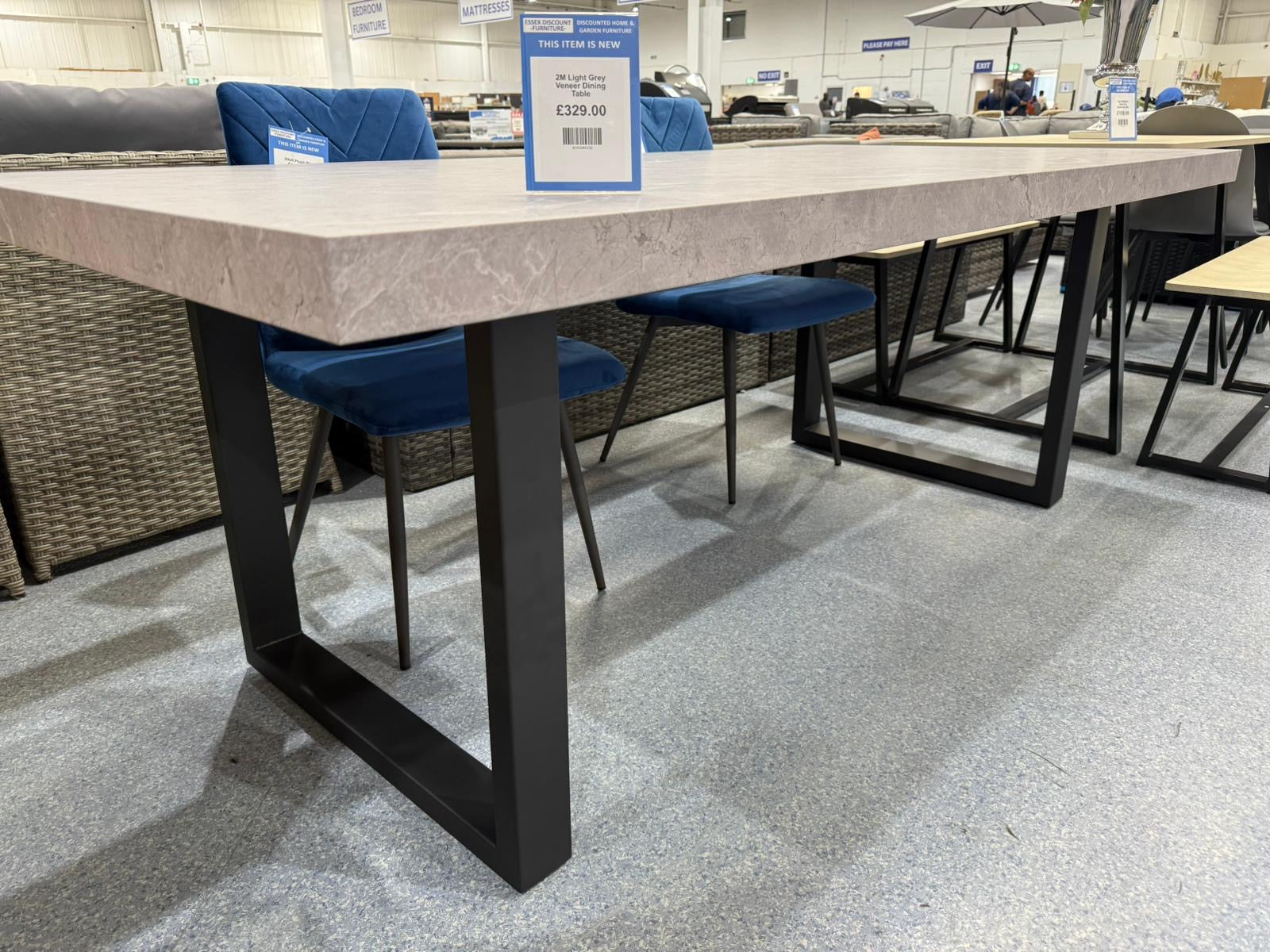 Light Grey Concrete Effect Veener Dining Table exudes elegance, with its thick paper veneer table top and matt black powder coated legs.